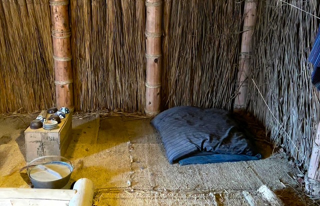 草葺きの掘っ立て小屋の、床もなく地べたに野草を敷き、その上にムシロを重ね、入口はムシロを一枚下げただけの、壁は草壁で、あまりに寒い家だ。