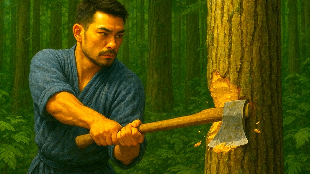 巨木の原始林と、鉄の網のように密生するクマザサを取り除くことから始まり、マサカリやノコギリ、鍬で木を掘り起こし、石をどけ、クマザサなどの地面に張り付いた植物を切った。